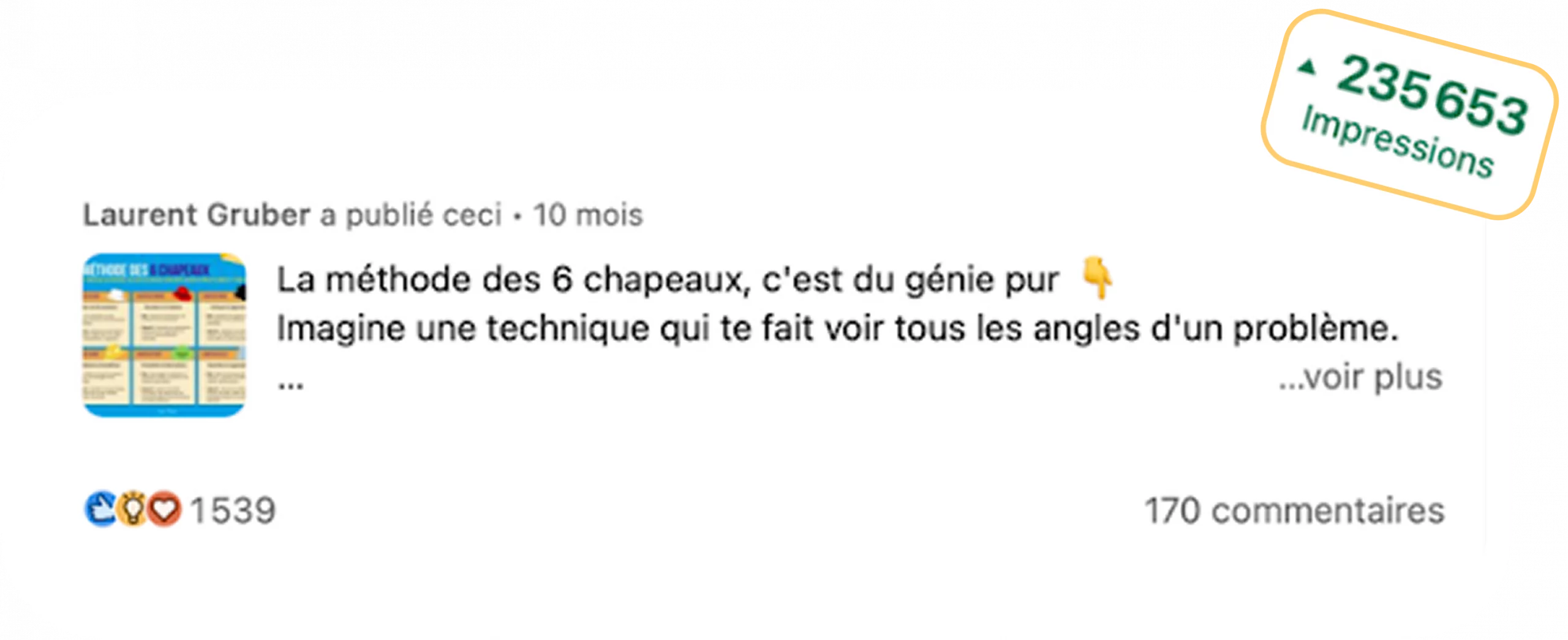 Chaque semaine, je te propose les posts, les visuels et la planification. Tu valides, je peaufine, et hop : ton contenu part à la conquête de LinkedIn pendant que tu te concentres sur ta zone de génie business.